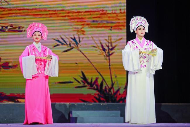 本次演出主题为“赓续传承·艺熠生辉”,共包含《梨园春蕊·凤新鸣》《蜀风雅韵》《梁祝·十八相送》《蝴蝶梦·劈棺》《梁祝·楼台会》《梦寻伊人》《琼瑶诉冤》《虹桥赠珠》选段等经典曲目。演员们身姿优美,唱腔婉转悠扬,将角色演绎得惟妙惟肖;器乐教研室师生的伴奏配合默契,将现场气氛不断推向高潮,赢得观众的阵阵掌声和叫好声。在表演过程中,演员向观众展示了大量的跳、转、翻技巧,“毯子功、把子功、腰腿功、身段功”四门基本功扎实,尽显开云官网琼剧专业学子的精神面貌。