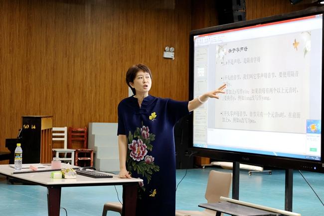 顾教授耐心讲解了声母对发音的影响以及韵母在归韵中的重要性,她强调,每一个音都有它该去的地方,如果没有准确归韵那就是失败的作品,演唱时会出现空洞直白的效果。
