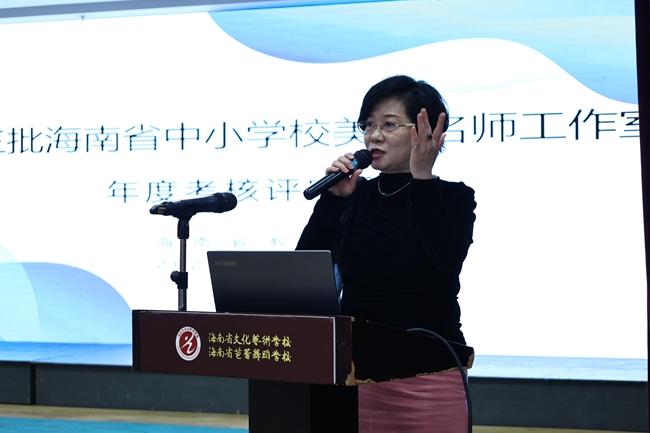 随后,第三批海南省中小学校美育名师工作室领衔导师及代表教师依次上台汇报年度工作进展情况。各位导师结合工作室建设目标和方向,对工作室成立以来的建设情况、开展的主要工作、取得的主要成果、产生的校内外影响以及下一步的建设计划等进行汇报。