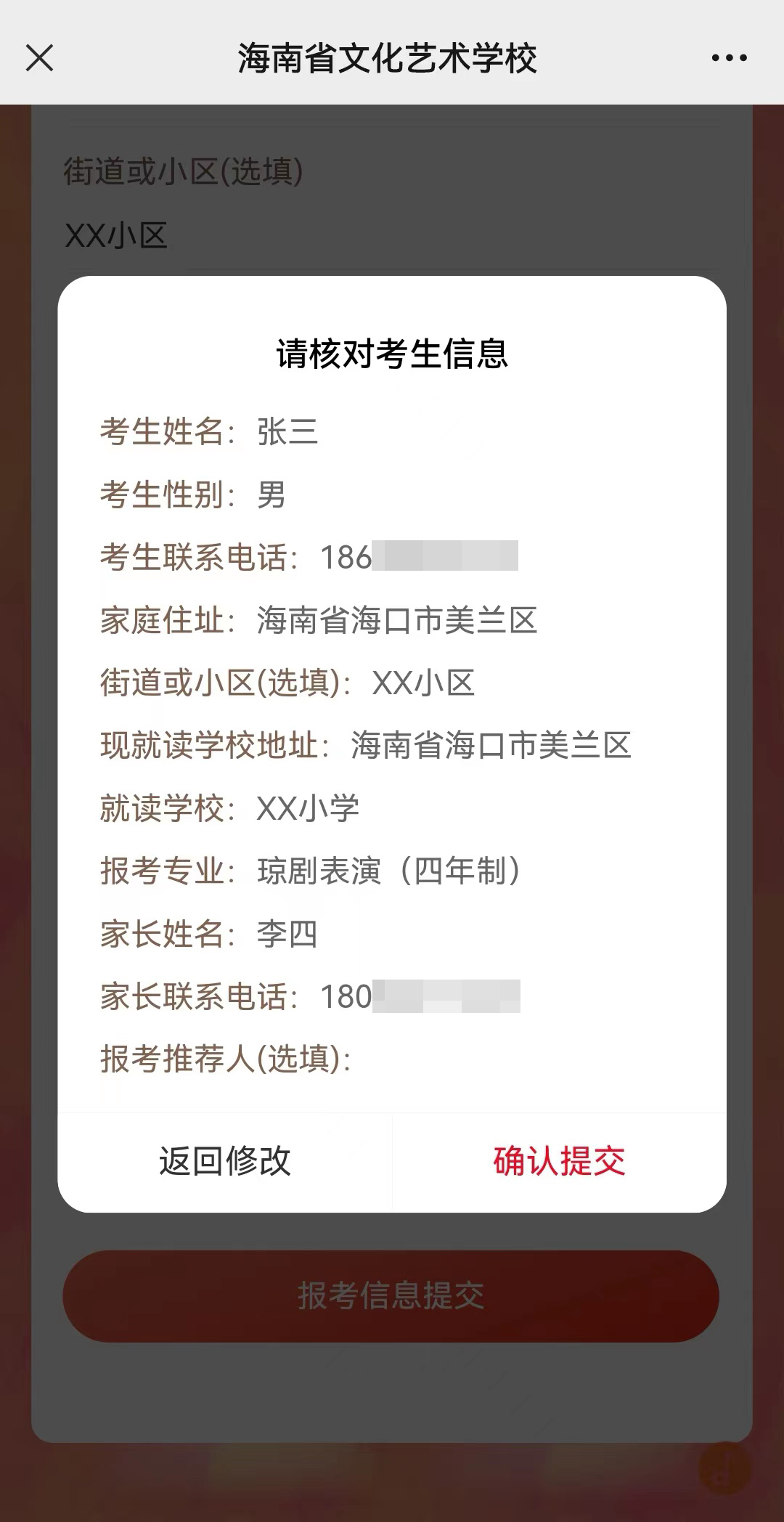 ①扫描二维码进入在线报名页面,填写个人信息。②核对个人信息,确认无误后点击“确认提交”。