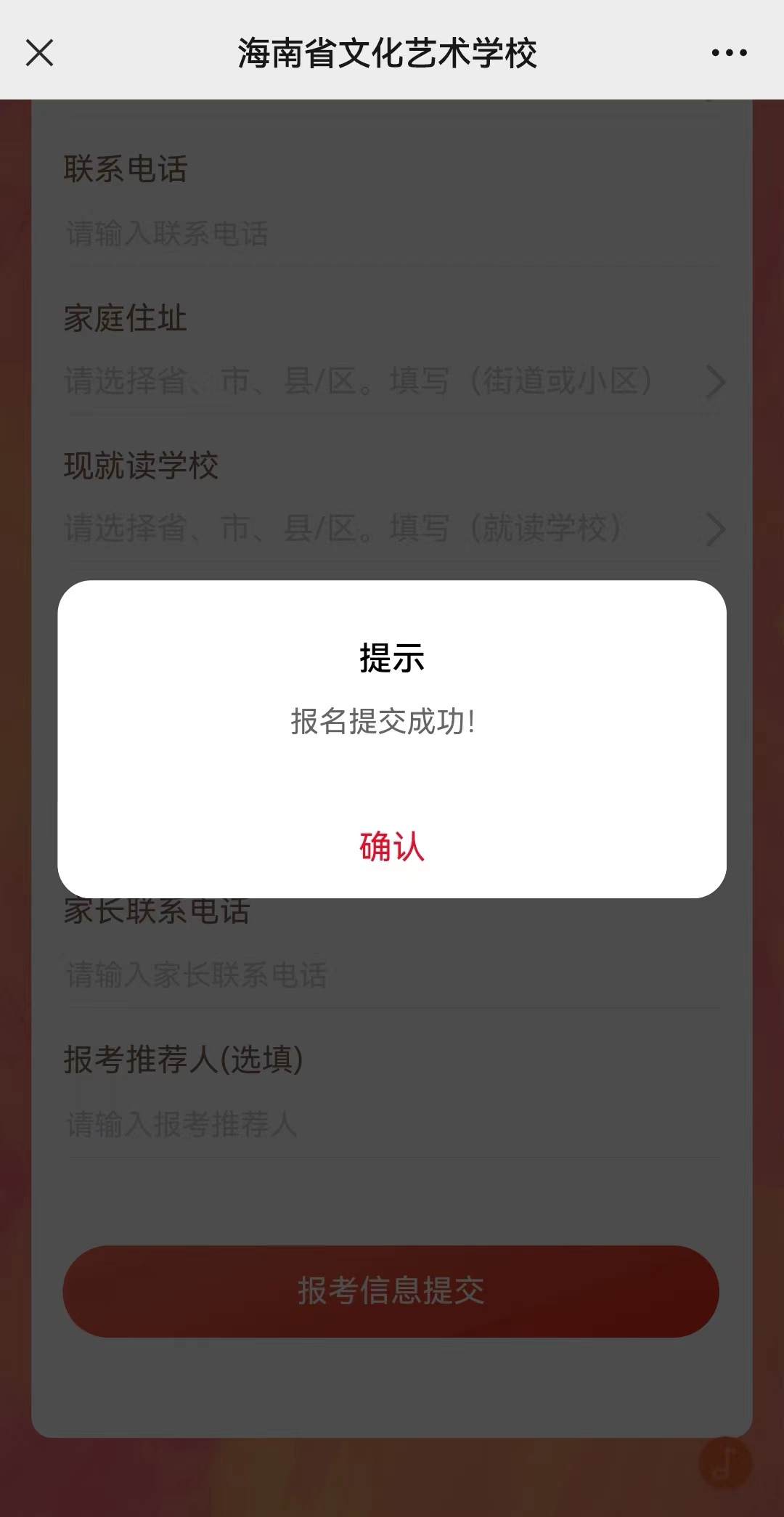 ③提交信息后系统提示“报名提交成功”,点击“确认”,本次报名完成。