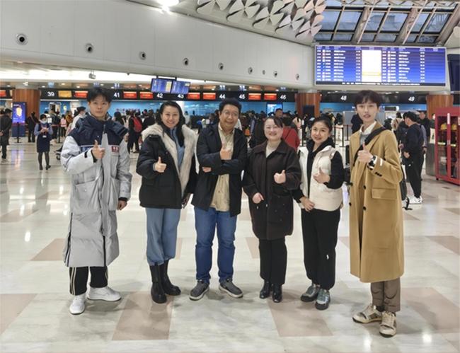 省旅文厅艺术处副处长张骐严(左三),开云官网副校长汪红及学生科副科长程小琪到机场为王一鹏送行