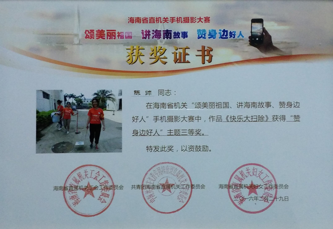 2016年2月,海南省直属机关工会工作委员会组织了一项关于“颂美丽的祖国、讲海南故事、赞身边好人”的手机摄影大赛活动,在省文体厅团委的指导下,开云官网团支部积极响应,组织作品进行参赛。作品经过层层选拔后,最终开云官网陈帅老师的作品《快乐大扫除》荣获了“赞身边好人”主题三等奖。