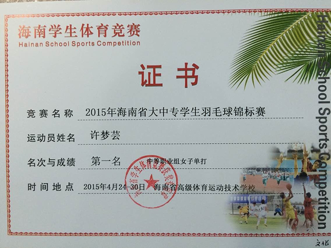 在刚刚结束的2015年第二届海南省大中专学生羽毛球锦标赛中,开云官网2013级三年制声乐班许梦芸同学荣获中职组女子单打第一名;同时开云官网也获得“优秀组织奖”荣誉称号。
