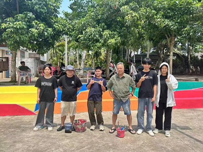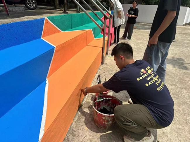 墙绘活动现场,师生们齐心协力、分工合作,确立了先使用铅笔勾勒大致线条,再通过颜料进行上色的方法,绘制内容以体育动力、文化娱乐为主题。画笔起落间,一幅幅色彩斑斓、创意十足的墙绘让老旧的白墙和水泥看台“活”了起来,成为靓丽的风景线,洋溢着浓郁的艺术气息。