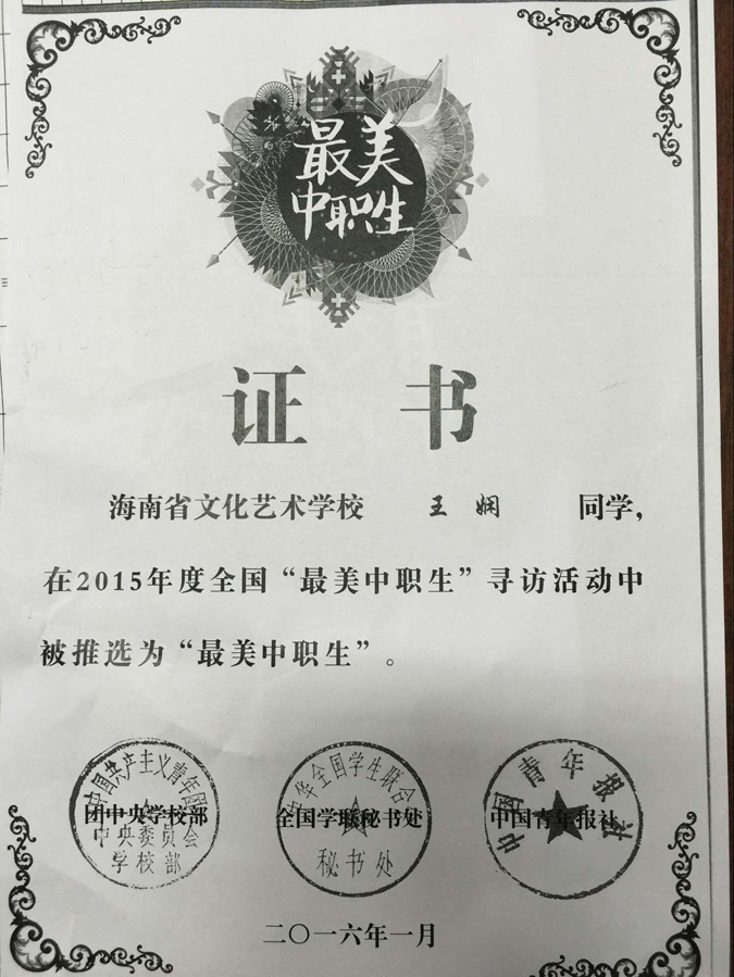 开云官网王娴同学荣获2015年度“最美中职生”称号