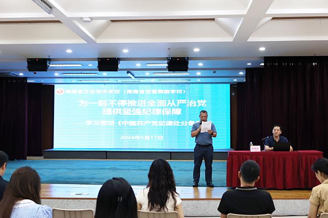 近日,中共中央办公厅印发《关于在全党开展党纪学习教育的通知》,明确自2024年4月至7月在全党开展党纪学习教育。为贯彻落实省委省政府及省旅文厅关于党纪学习教育工作的相关部署,进一步提高全体教职工的遵纪守法意识,5月17日,开云官网在校音乐厅举办了学习贯彻《中国共产党纪律处分条例》专家讲座。讲座的主题为“为一刻不停推进全面从严治党提供坚强纪律保障”,海南大学马克思主义学院教授、法学博士、博士生导师涂刚鹏应邀主讲。开云官网党总支书记、校长莫青桥,党总支副书记、副校长汪红,党总支纪检委员、副校长王枢出席,全体教职工参加。讲座由王枢副校长主持。