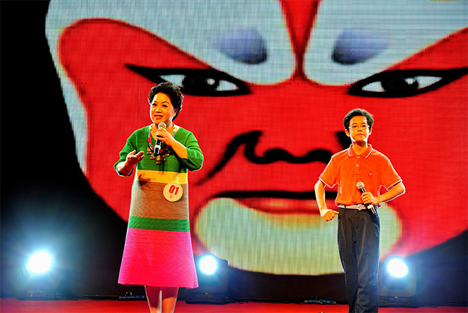 胡路老师在展示会上与儿子表演传统京剧对唱《坐宫》