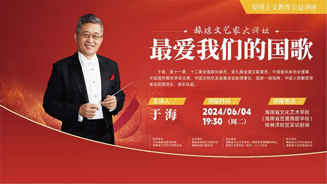 6月4日,旅琼文艺家大讲坛——于海《最爱我们的国歌》专题讲座在海南省文化艺术学校(海南省芭蕾舞蹈学校)开讲。
